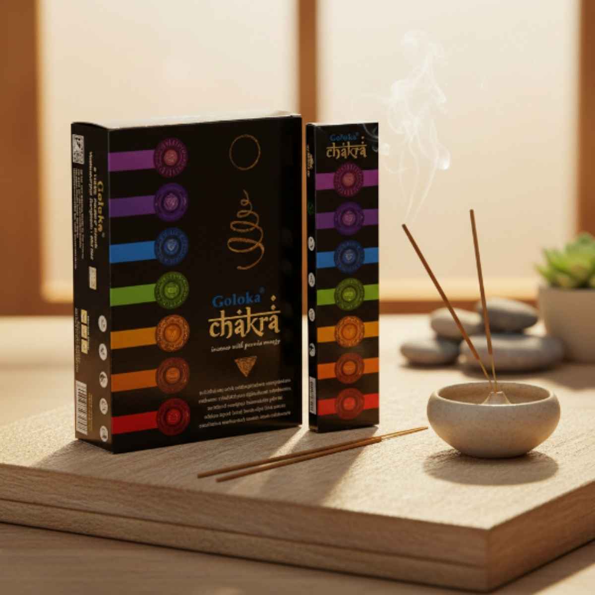 El Incienso Chakra de Goloka está inspirado en la energía de los siete centros principales del cuerpo. Su fragancia está diseñada para equilibrar, armonizar y despertar la energía vital, convirtiéndolo en un aliado perfecto para la meditación, el yoga o los rituales de sanación energética.