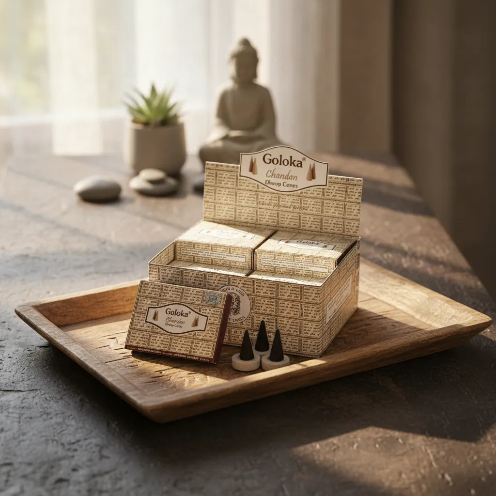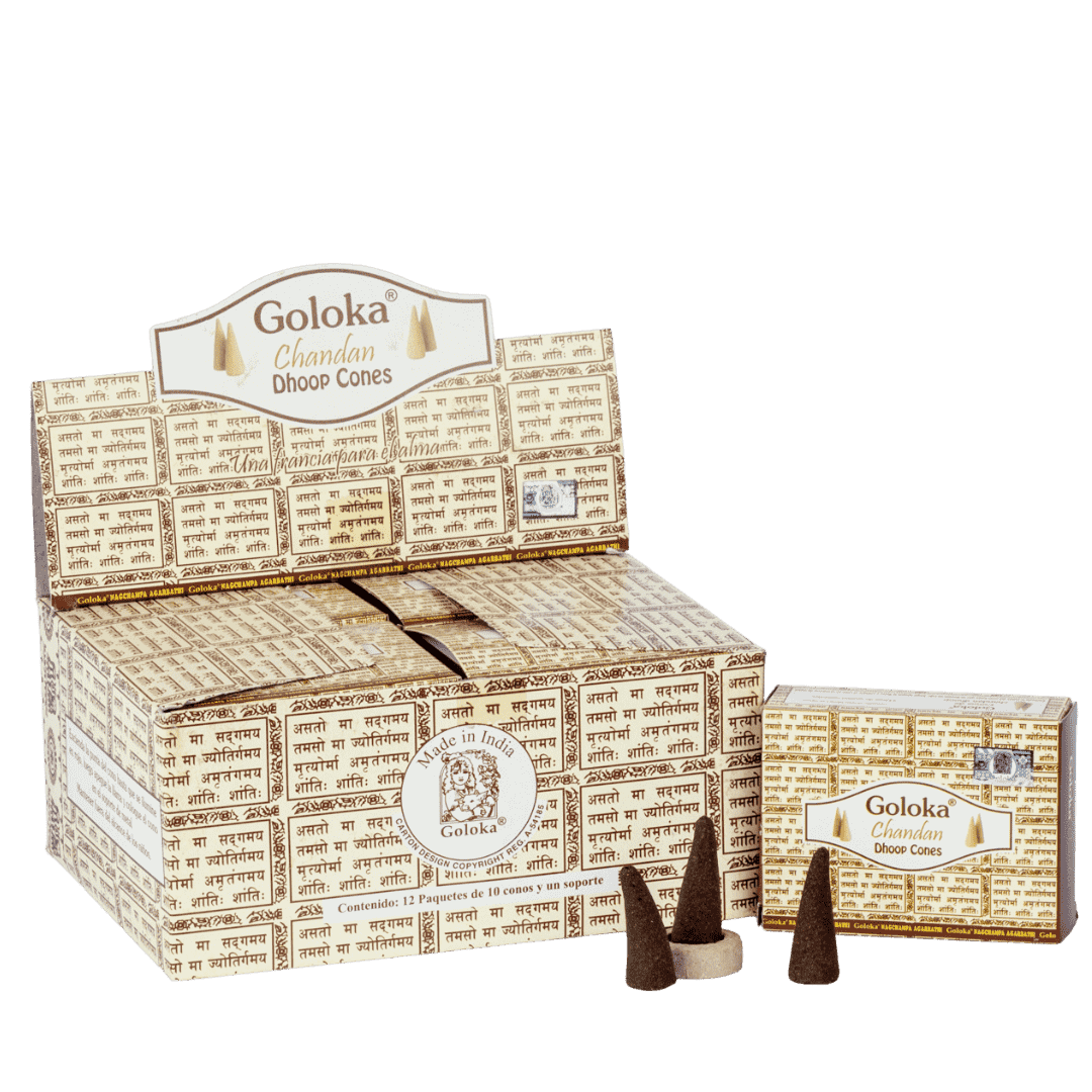 Un incienso clásico de la India elaborado con madera de sándalo (Chandan), reconocido por su fragancia purificadora y su poder espiritual. Cada cono desprende un humo dulce y envolvente, ideal para la meditación, la relajación y la armonización de los espacios. Elaborado por Goloka, marca de prestigio en inciensos artesanales.