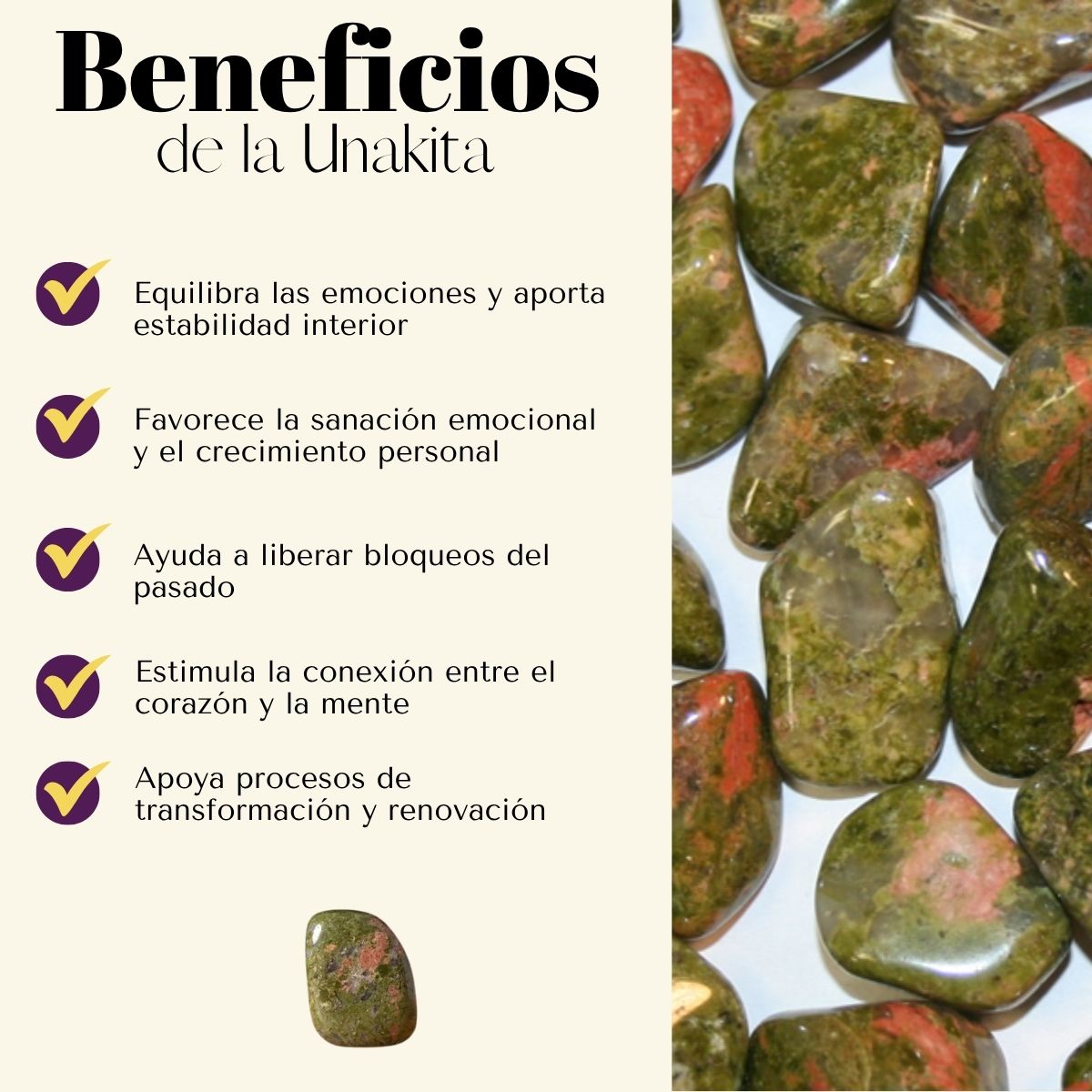 La unakita es conocida como una piedra de transformación emocional. Favorece la introspección, el perdón, la calma y la estabilidad en momentos de cambio. Su energía amorosa ayuda a mantener la serenidad y a avanzar con claridad, integrando el equilibrio entre lo emocional y lo racional.