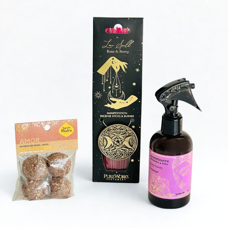 Este kit está enfocado en activar la energía del amor, la dulzura y la conexión emocional. La combinación de aromas envolventes, símbolos de protección y piedras energéticas crea una experiencia que celebra el vínculo, el afecto y el amor propio, ideal para regalar el 14 de febrero.