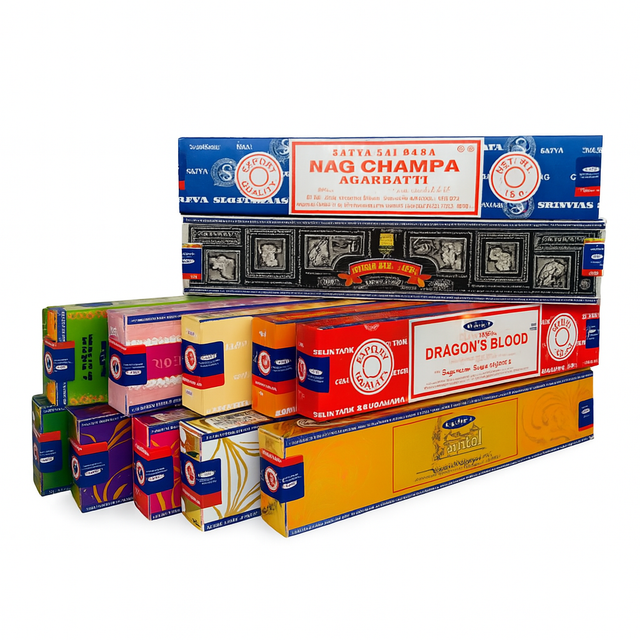 Cada pack incluye 12 aromas distintos de la colección Satya (pueden variar entre los más de 60 disponibles), siempre manteniendo como base el icónico Nag Champa, el incienso más famoso y aclamado del mundo. Sus fragancias transmiten armonía, limpieza energética y bienestar espiritual, adaptándose a cada momento del día.