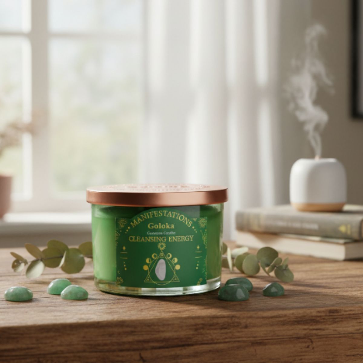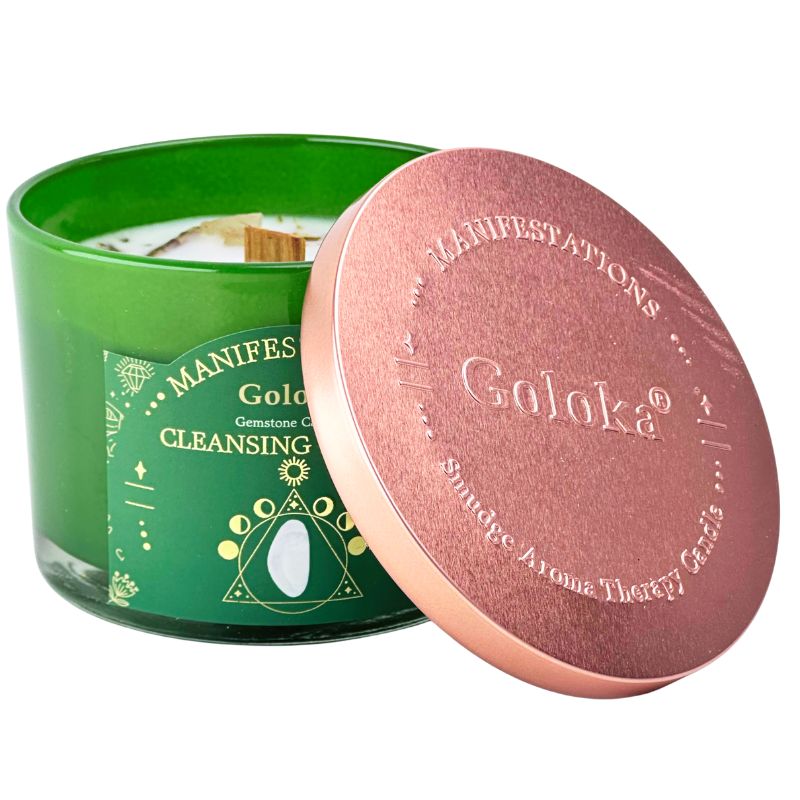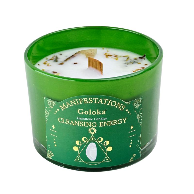 La vela Manifestations Cleansing Energy de Goloka une el poder de la aromaterapia con la vibración sanadora de la Selenita, creando una experiencia de limpieza y elevación energética. Su mecha de madera no solo asegura una combustión limpia y uniforme, sino que además aporta un suave crepitar similar al de una chimenea, generando una atmósfera cálida, purificadora y profundamente espiritual. Con el aroma fresco y depurador de la salvia blanca, esta vela favorece la claridad mental, la armonización de emociones y la conexión con planos superiores.