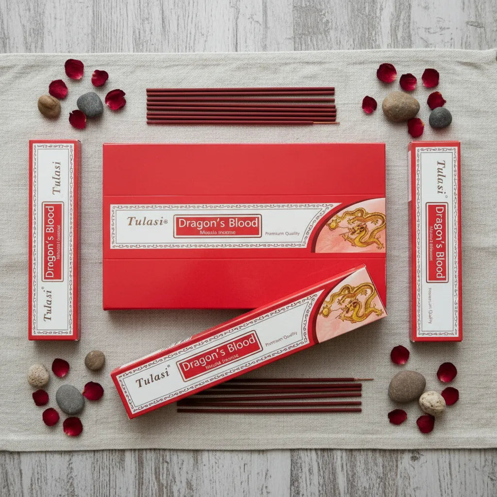 ✦ El Incienso Sangre de Dragón Tulasi es perfecto si buscas una fragancia intensa y protectora que limpie profundamente tu espacio y eleve tu energía.