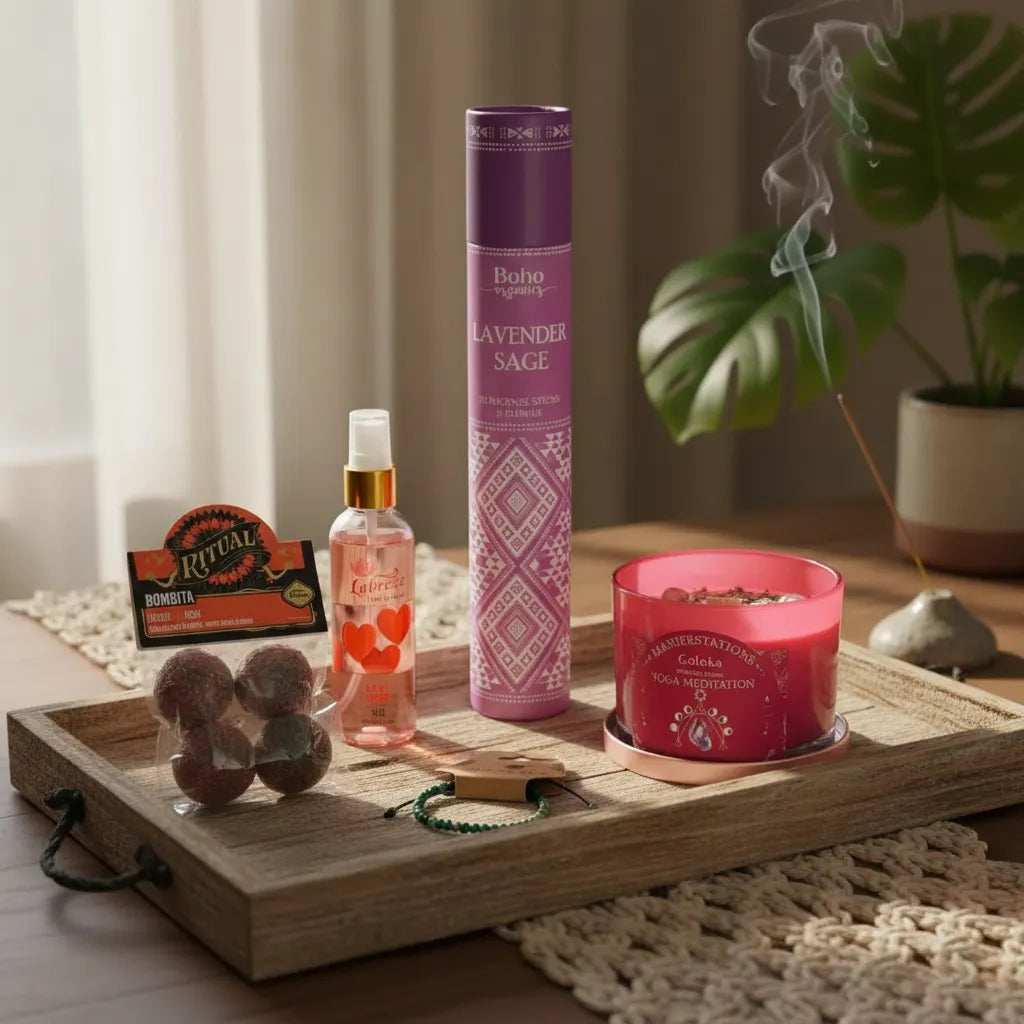 Utilizar los productos de forma complementaria para potenciar la experiencia: encender la vela en un espacio tranquilo, acompañar con incienso o spray, y usar la pulsera como recordatorio diario de intención. Mantener fuera del alcance de niños y mascotas y seguir las indicaciones de cada producto.