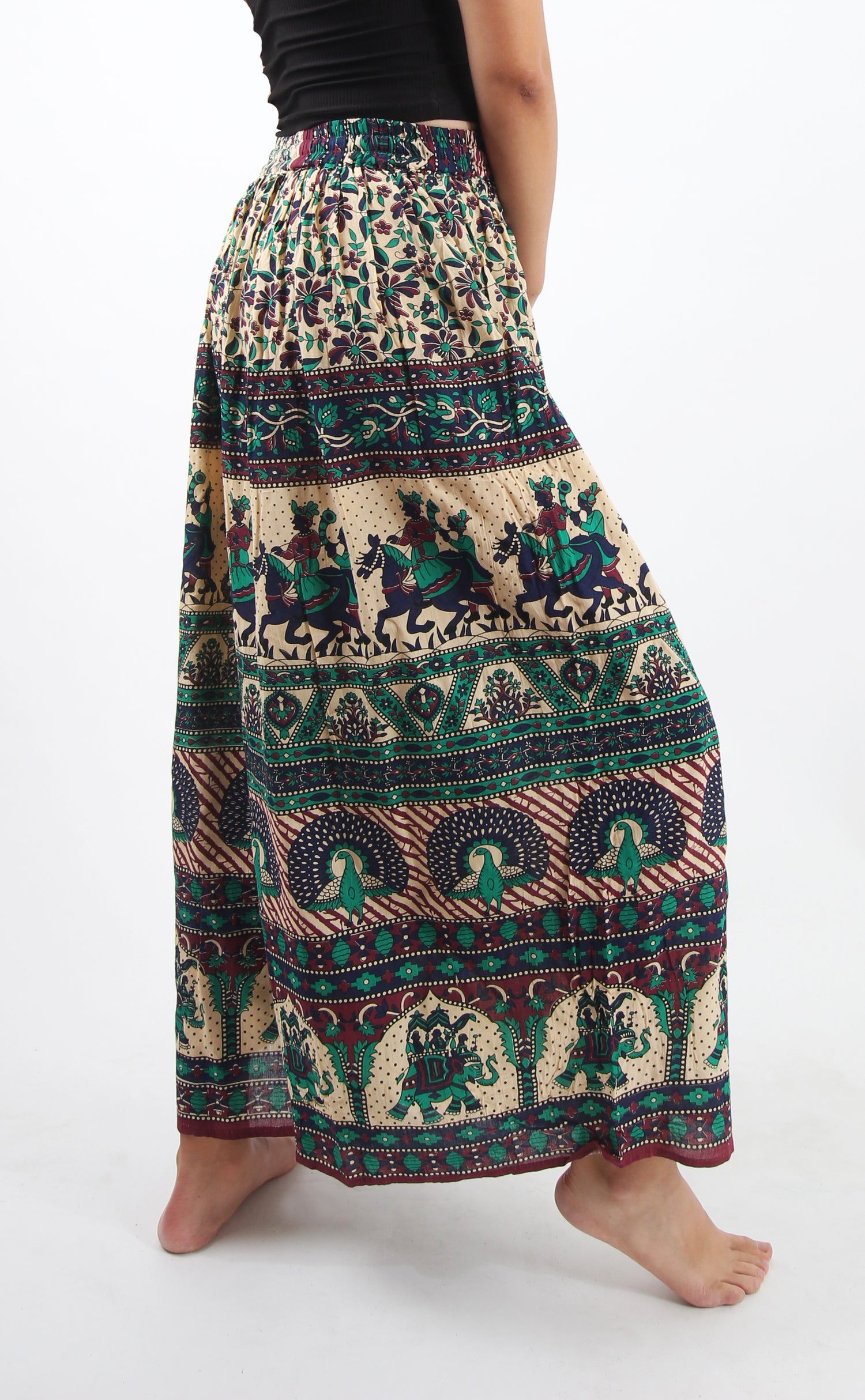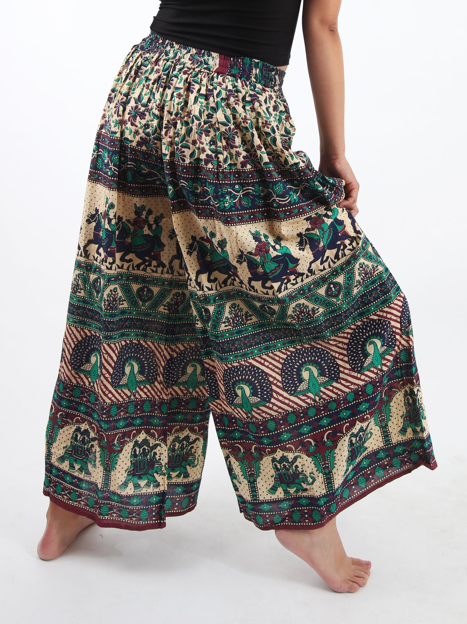 El pantalón palazzo en tono verde con estampado completo es la prenda ideal para quienes buscan un look vibrante y sofisticado. Su silueta amplia aporta un movimiento fluido y femenino, mientras que la cintura alta y elástica asegura un calce cómodo y favorecedor. El estampado integral convierte cada pieza en un diseño único, con un aire bohemio chic que no pasa desapercibido.